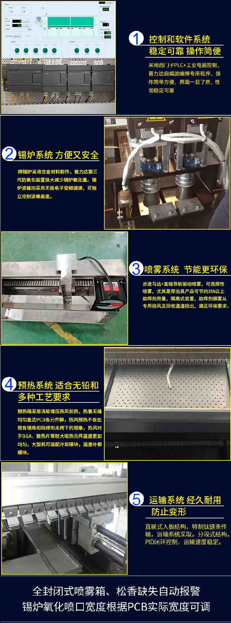 ● 锡炉自动进出功能,助焊剂自动检测抽取装置,维护简便