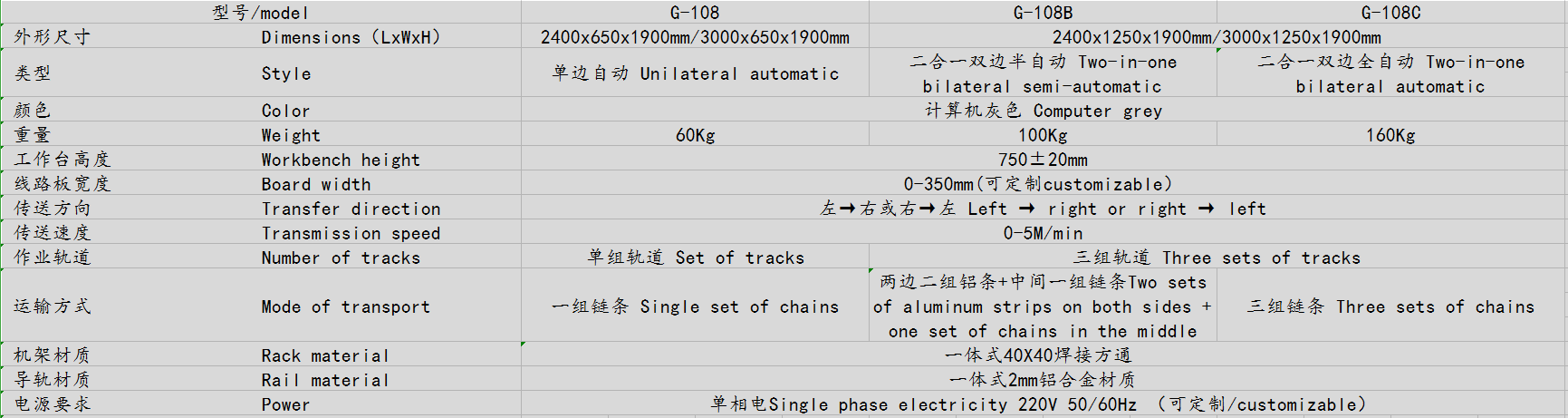 1、动力系统:采用1Φ220V 60W调速马达,速度V=1-5M/min可调;传送方向从左到右,传输链为优质尼龙链条