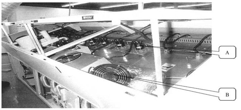 图2-2-35 中B 处为热风冷却循环系统。它将茄子黄色视频下载冷却区中的热空气进行冷却再将冷空气输送到茄子黄色视频下载冷却区,达到更好的冷却效果。