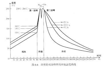 各区域温度与持续时间同样是由设备各区温度设定、熔融焊料温度与传送带的运行速度来决定的。波峰焊温度曲线测量仍然需要通过测试手段确定,其基本过程也与回流曲线测定类似。由于PcB的正面(面,Top—orBoard)般贴装密集,因此温度曲线可只检测面温度。测试时,确定传送带速度,然后记录试验板面少三个点的温度。反复调整加热器温度值使各点温度达到设定的曲线要求,后再进行实装测试并进行必要的调整。在编制工艺文件时,除了记录加热温度曲线设定外,般还要记录焊剂及其徐布工艺参数(泡沫高度、喷射角度、压力、密度控制要求以及焊剂情理等),焊料波参数、焊料捡测和撤渣要求等,这些都是波峰焊的主要工艺参数。