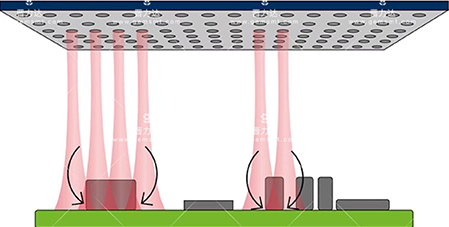 7、由于先进的孔喷嘴几何形状,出色的热传递以及加热模块中可监控的可调超压,保证均匀和无间隙的热传递到电路板。整个过程可以保证惰性工艺气氛焊接过程,因为是封闭的系统,没有外部空气进入处理室。 热流在系统内通过循环发生,即过程预热和峰值区域的气体被提取,清洗并从侧面重新插入过滤网。